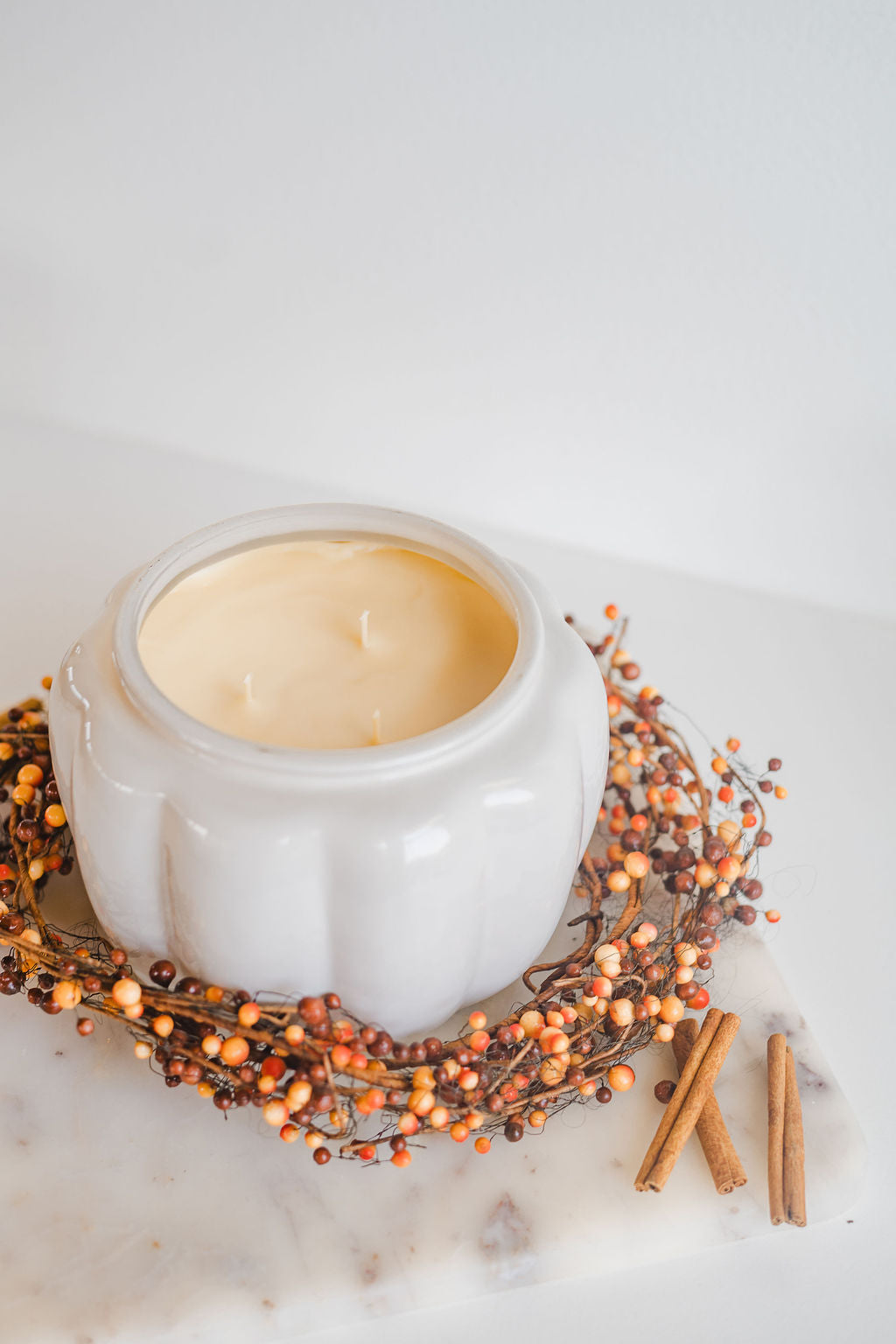 Cozy up to the ultimate fall indulgence with our 56oz Pumpkin Spice Ceramic Pumpkin Candle scented with Pumpkin Spice. Housed in a beautifully crafted ceramic pumpkin jar, this oversized candle fills your space with the nostalgic aroma of warm cinnamon, nutmeg, clove, and sweet pumpkin—everything you love about the season in one luxurious burn.