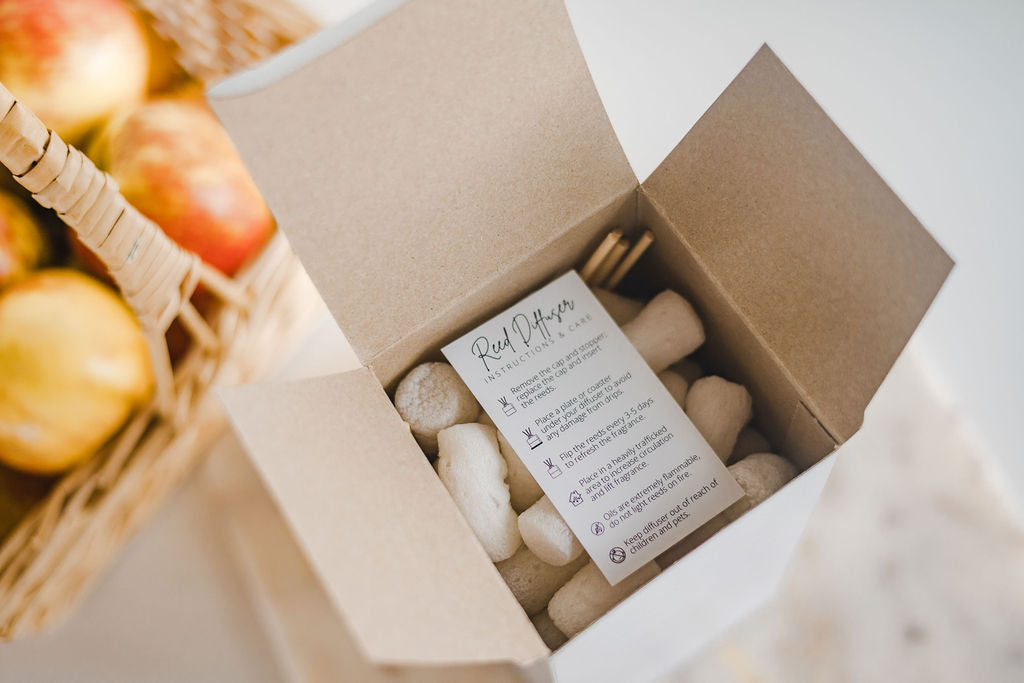 It comes with 6 all natural rattan reeds so you can adjust (we suggest starting with 4 and then adding or subtracting) the scent throw according to what works best for you.