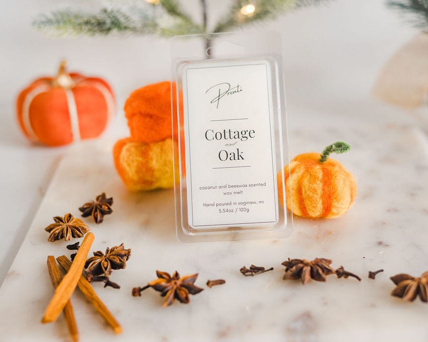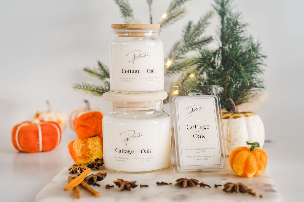 Inspired by the serene beauty of a countryside cottage nestled among golden trees, Cottage and Oak captures the essence of cozy autumn days and quiet nostalgia. This warm, inviting fragrance blends the creamy sweetness of coconut and fresh pumpkin with aromatic cedar leaf, nutmeg, and clove. As it settles, a grounding base of charred oak, smooth sandalwood, and white musk lingers—evoking the feeling of curling up by a crackling fire, wrapped in your favorite knit blanket.