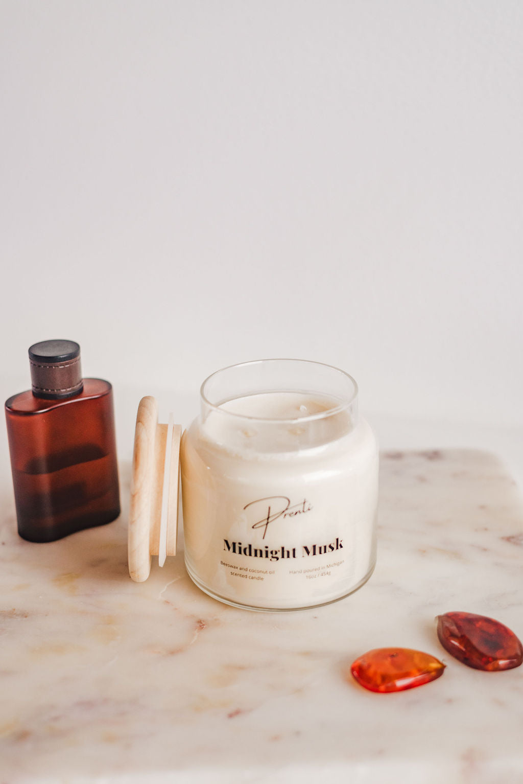 Dive into the darkly aquatic, aromatic experience of Midnight Musk. This sensual candle marries notes of lavender, amber, dark musk, and vetiver. A mossy, marine scent, Midnight Musk will capture your imagination and lend an air of mystery to your home --particularly catering to men but absolutely LOVED by many women. Reminiscent of a high-end cologne.