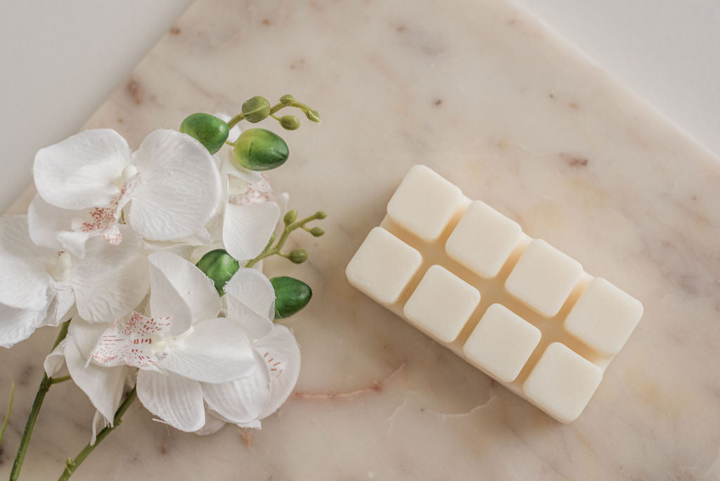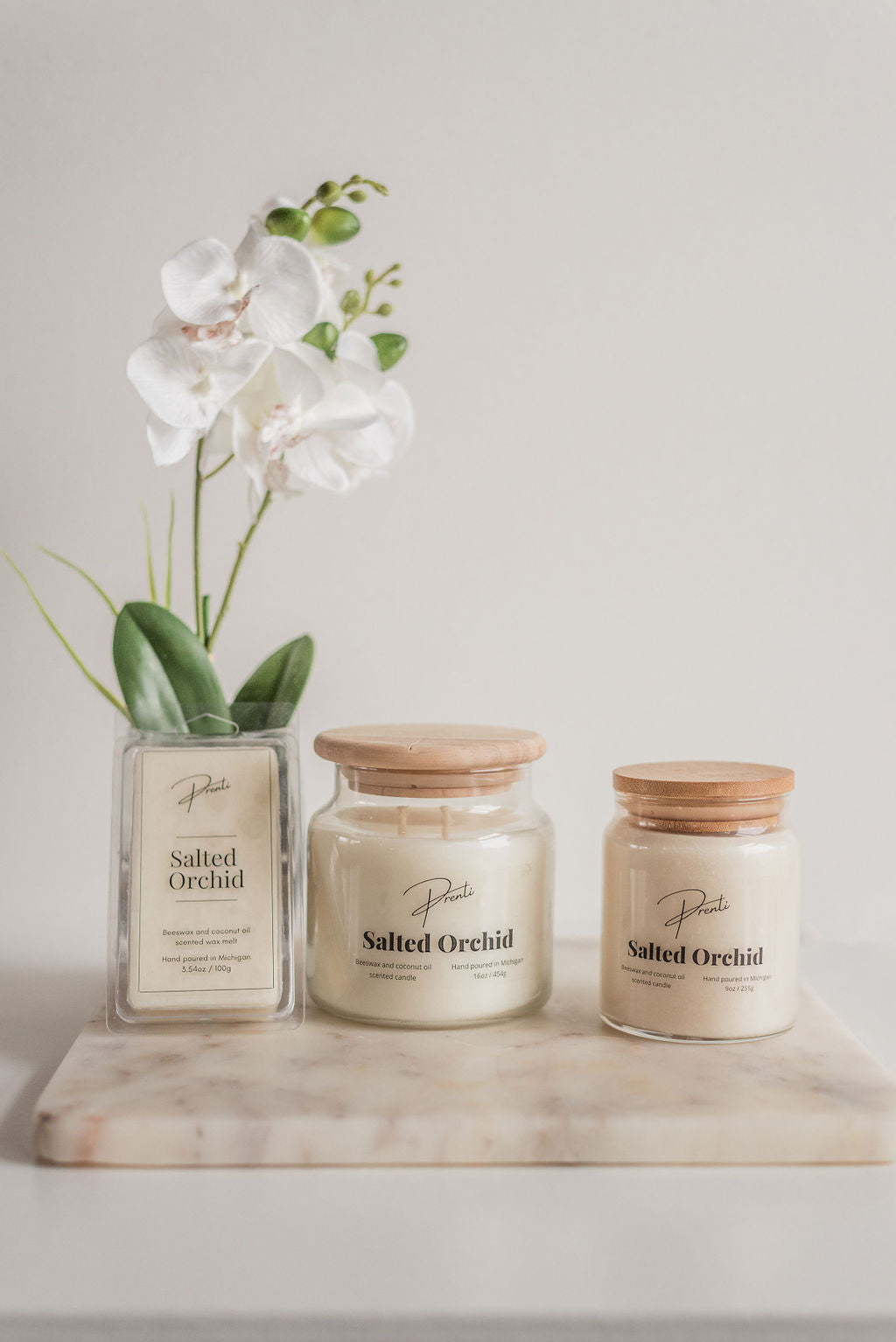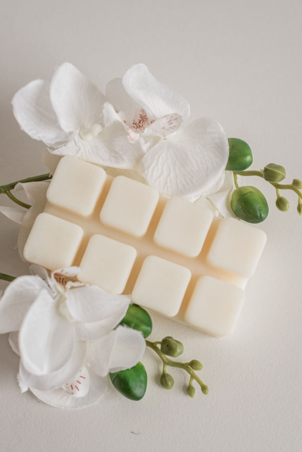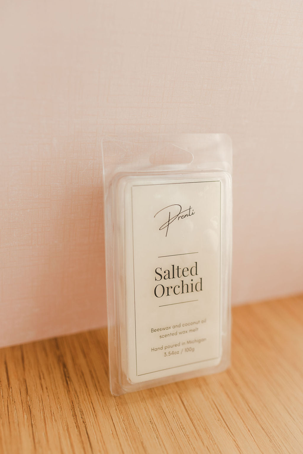 Salted Orchid This elegant fragrance blends the crisp, airy notes of sea salt with the soft, floral essence of orchid, creating a calming and serene atmosphere. Hints of jasmine, amber, and a touch of vanilla round out the scent, adding depth and warmth to the refreshing coastal vibe. Perfect for bringing a touch of the ocean’s tranquility to any room, this melt creates a peaceful, luxurious environment with every use.