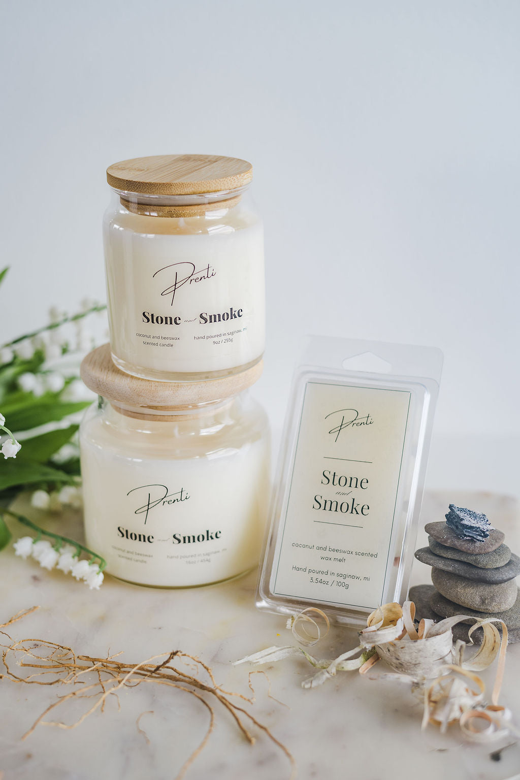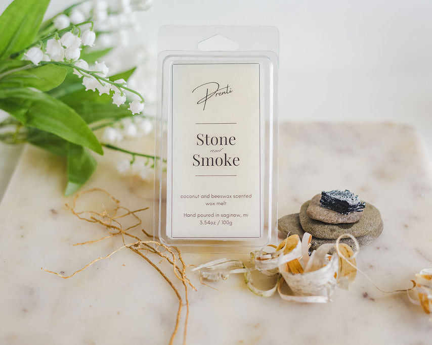 Grounded yet luminous, Stone and Smoke is the essence of a quiet evening spent fireside. This warm, inviting blend opens with crisp bergamot, lemon peel, and orange zest—bright notes that spark the senses. At its heart, soft floral touches of lily of the valley and geranium mingle with the subtle strength of white birch, creating a balanced contrast of delicacy and depth. Anchored by a smoky-smooth base of tonka bean, vetiver, and cedarwood, this scent is both earthy and elegant—perfect for fall and winter nights.